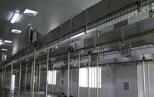 Air conveyor is a bridge between the unscrambler/blower and 3 in 1 filling machine. Air conveyor is supported by the arm on the ground; the air blower is settled on the air conveyor. Each inlet of air conveyor has an air filter to prevent dust coming into. Two set of photoelectric switch settled in the bottle inlet of the air conveyor. The bottle is transferred to 3 in 1 machine through wind.